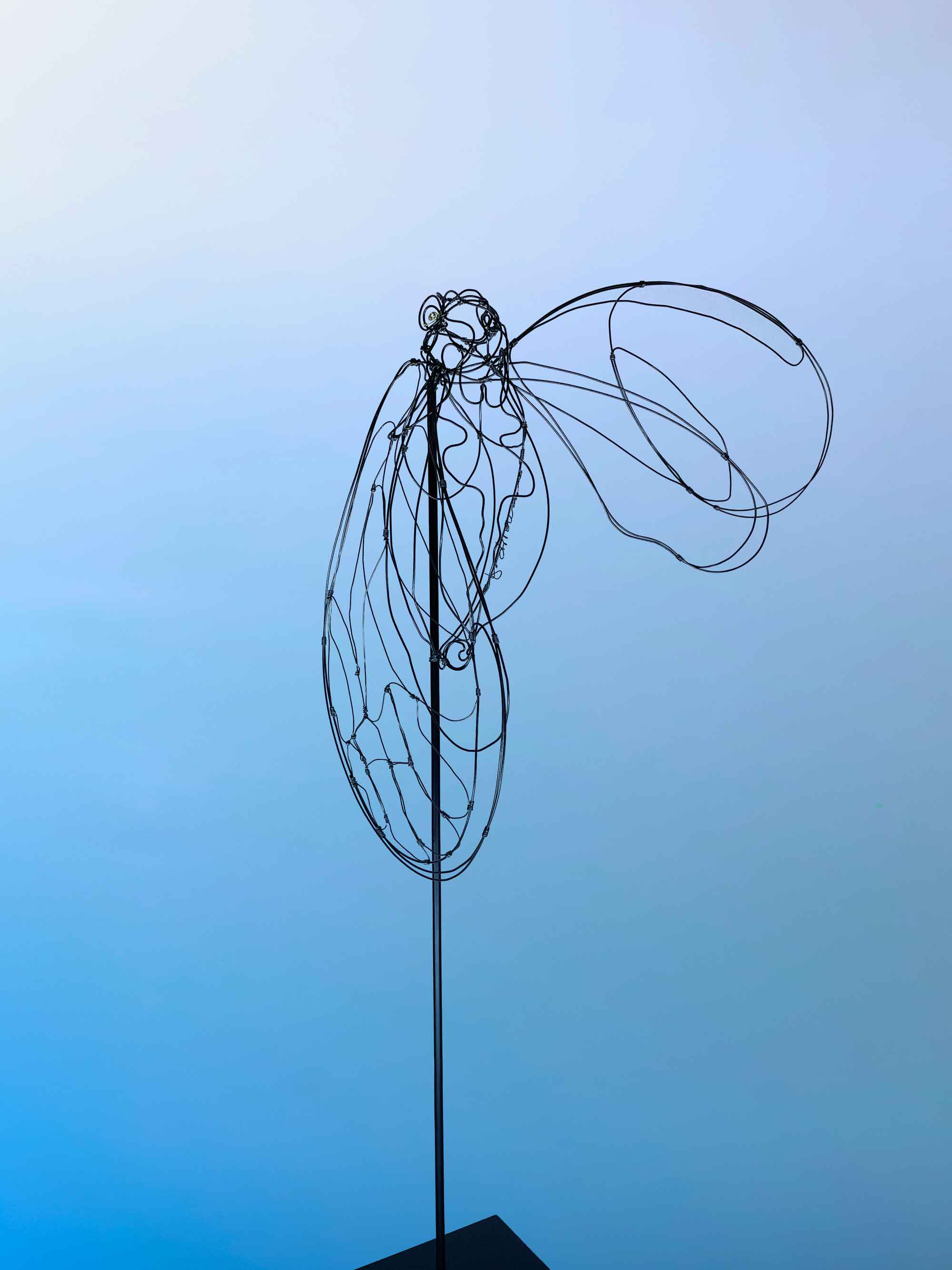 Je la représente à travers une ligne de métal très graphique et volontairement asymétrique, cherchant à traduire l’énergie vibrante de cet insecte emblématique.