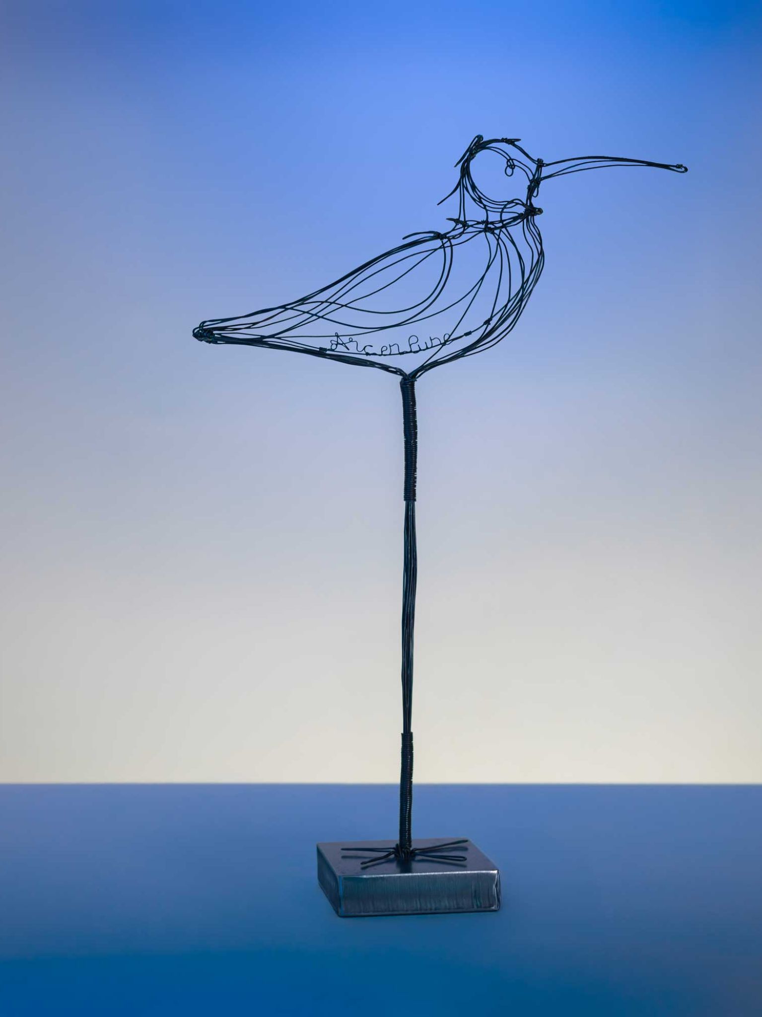 J’ai voulu en capturer l’essence avec cette sculpture minimaliste, en fil d’acier recuit. Travaillé de façon graphique et épurée, le dessin du fil révèle la légèreté de l’oiseau, sa finesse, sa verticalité. Chaque ligne est pensée pour aller à l’essentiel, dans un équilibre entre tension et simplicité.