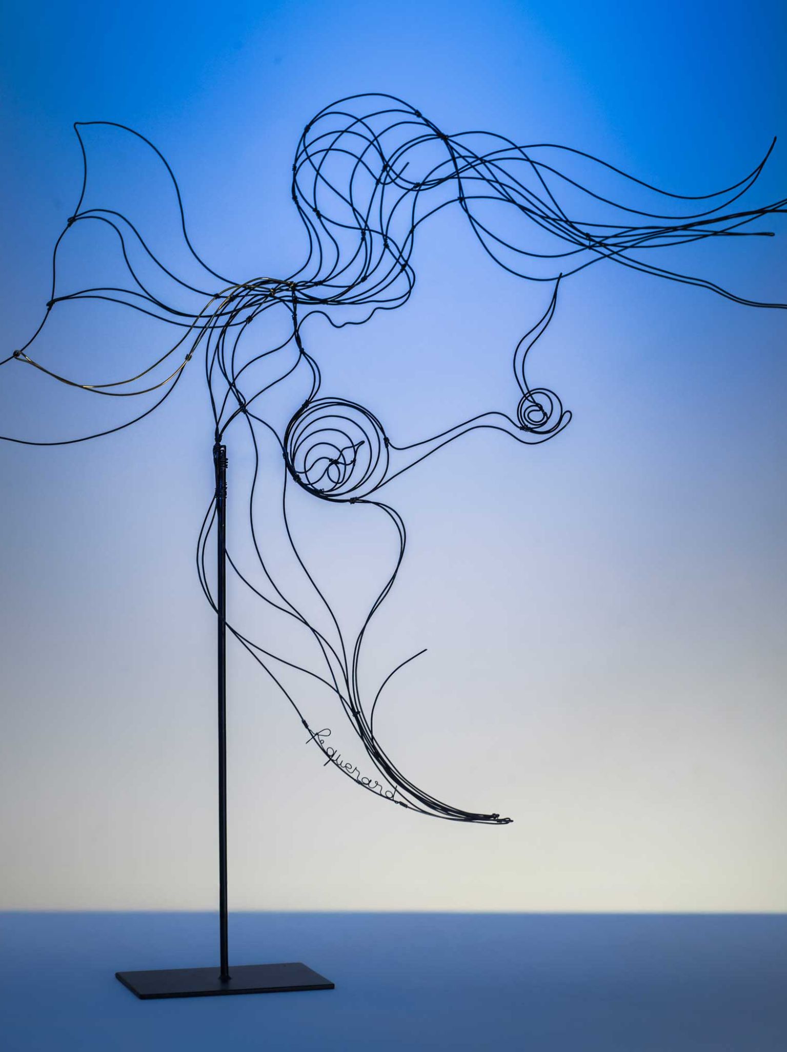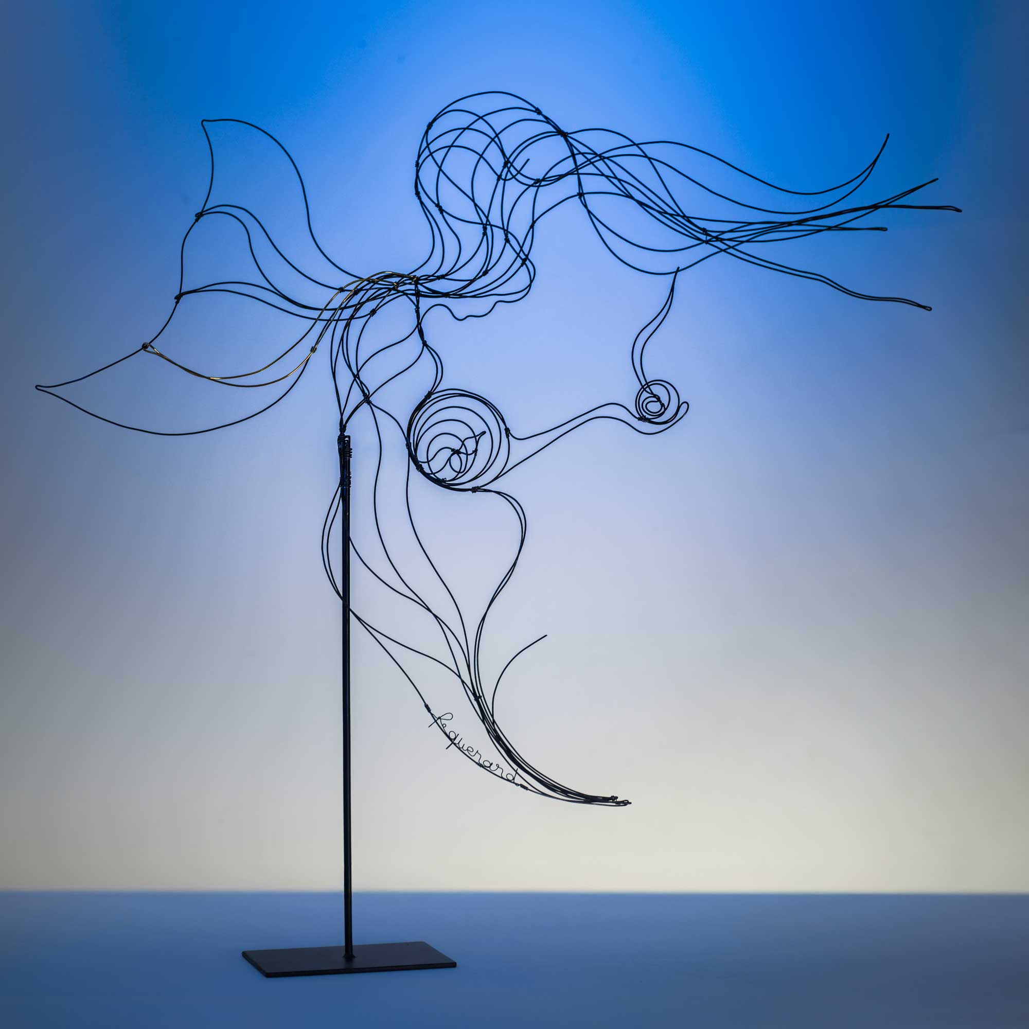 Cette sculpture incarne la mère, celle qui donne la vie, qui élève, qui transmet. Je l’ai façonnée à la main en fil d’acier, en laissant chaque ligne s’élancer librement dans l’espace. Les courbes et les volutes dessinent une danse aérienne, une énergie douce, fluide, presque organique.