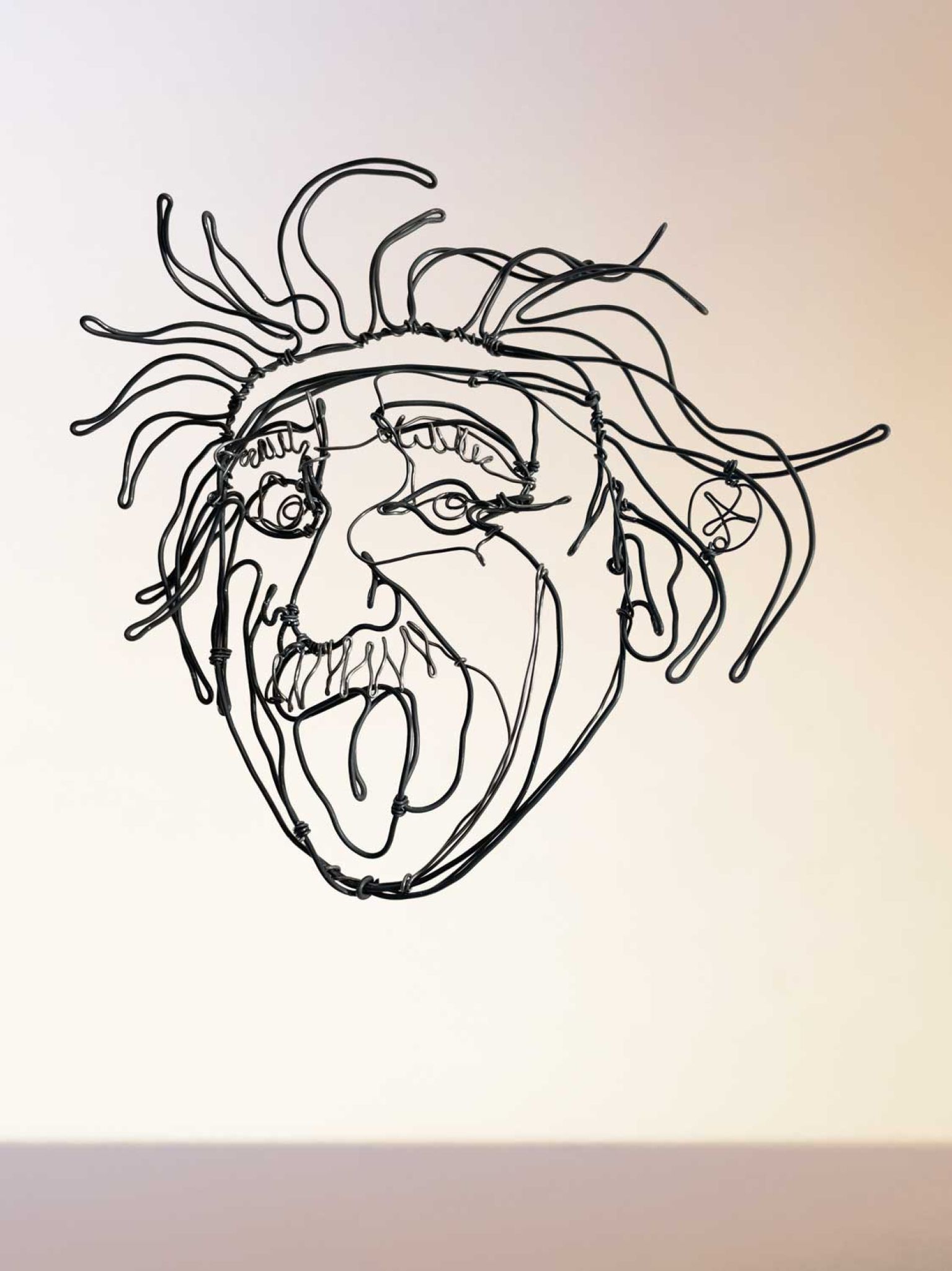 Cette sculpture, entièrement réalisée à la main en fil de métal, capture ce mélange unique d’intelligence et d’ironie.