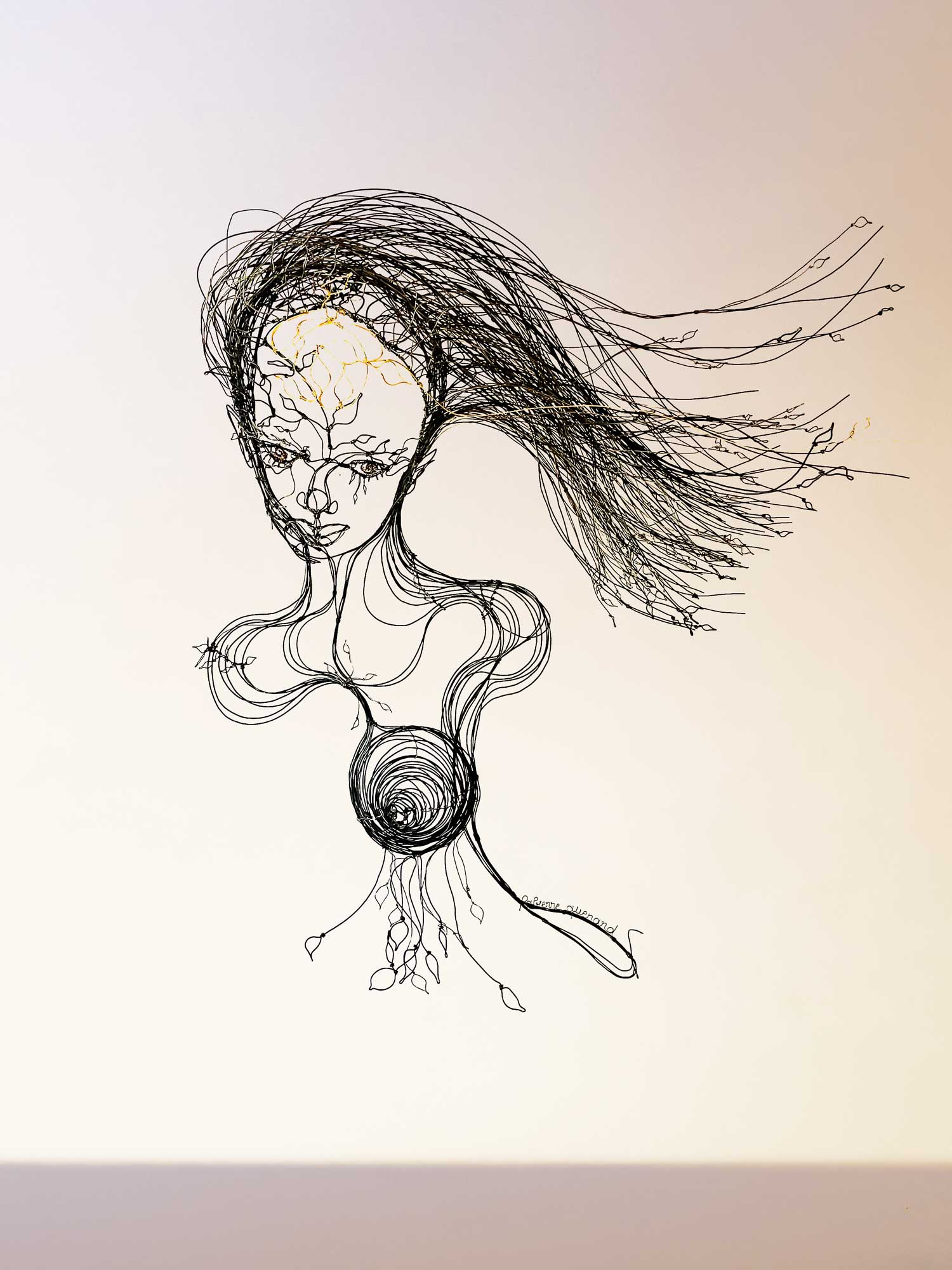 Le fil de fer prend ici un rythme organique, comme porté par des courants. L’eau devient source et guide, elle donne naissance à des courbes fluides, souples, vivantes. Puis le vent s’invite, soulève la matière, l’effleure, l’anime. Chaque ligne semble suspendue, comme en apesanteur.