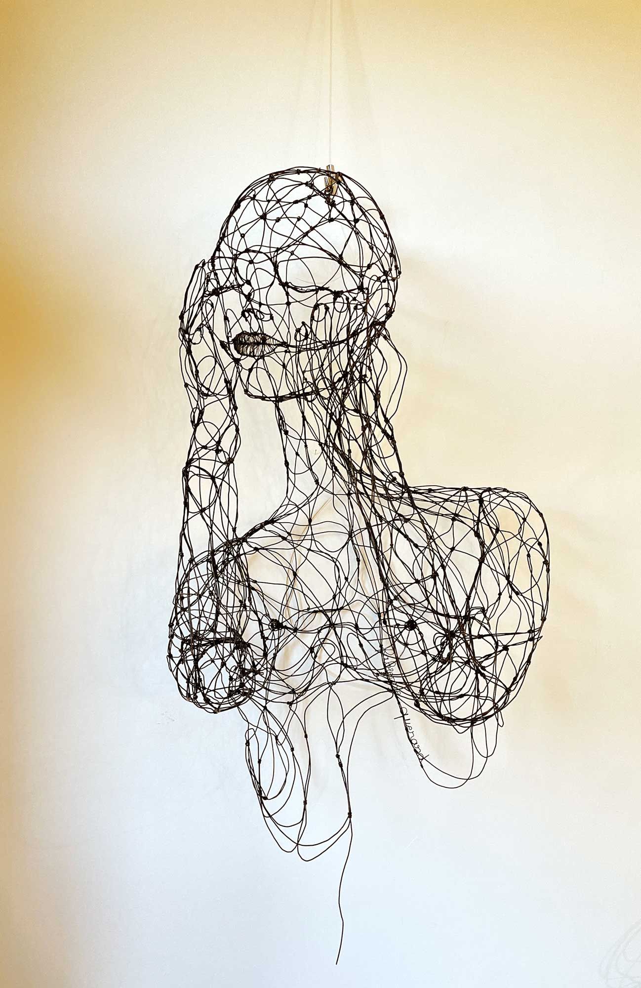Cette sculpture représente un buste de femme noire, façonnée à la main en acier recuit. Elle porte dans ses gestes toute la douleur contenue, la retenue imposée, mais aussi une révolte silencieuse. Ses mains couvrent son visage, dans un cri muet. Sa nudité, assumée, renforce la tension émotionnelle : celle de femmes racisées, souvent invisibilisées, mais debout, dignes, et porteuses de lumière.