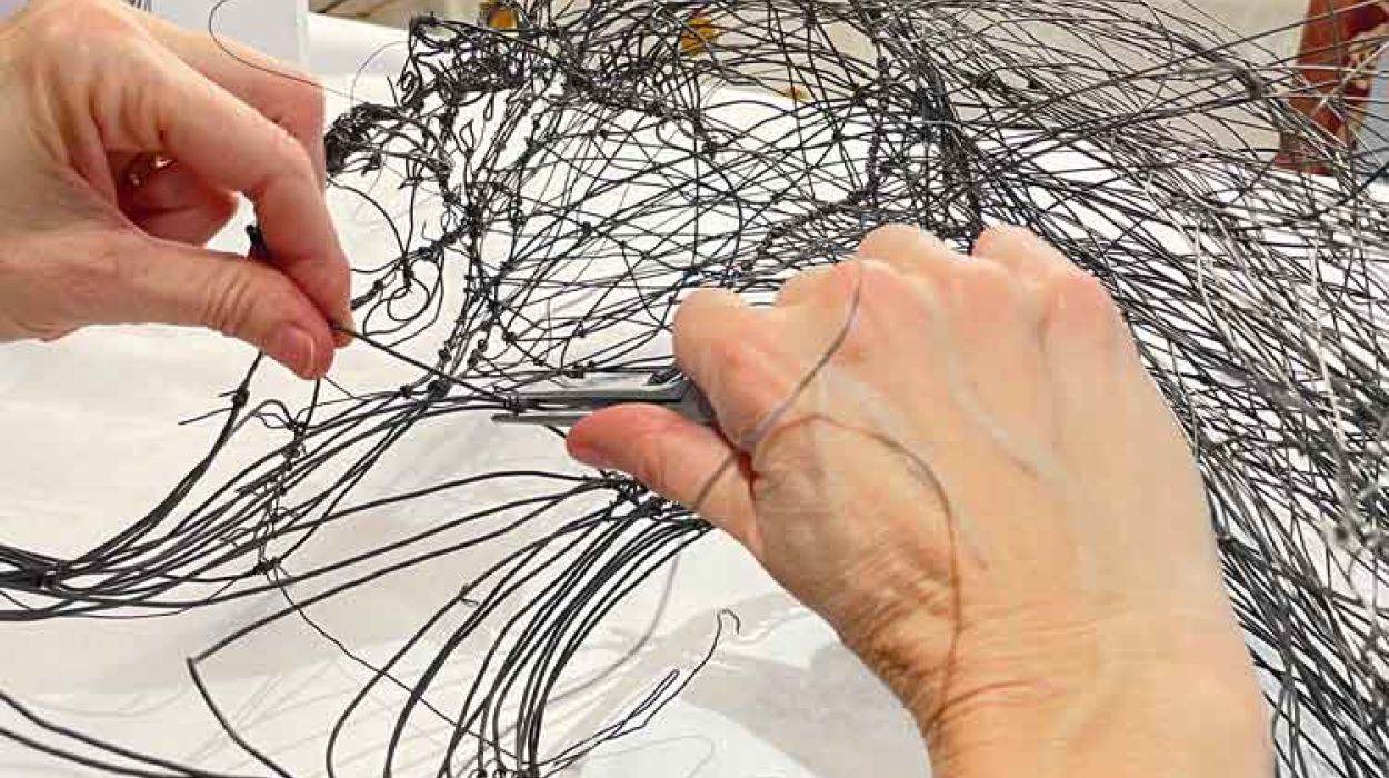 Je travaille le fil d'acier, laiton, cuivre, alu, inox à la main, sans aucune soudure ni découpe. Tout se construit d’un seul tenant, comme un dessin suspendu dans l’espace. Chaque pièce naît d’un croquis que je traduis en volume, en modelant le fil comme le ferait une brodeuse dans l’air.