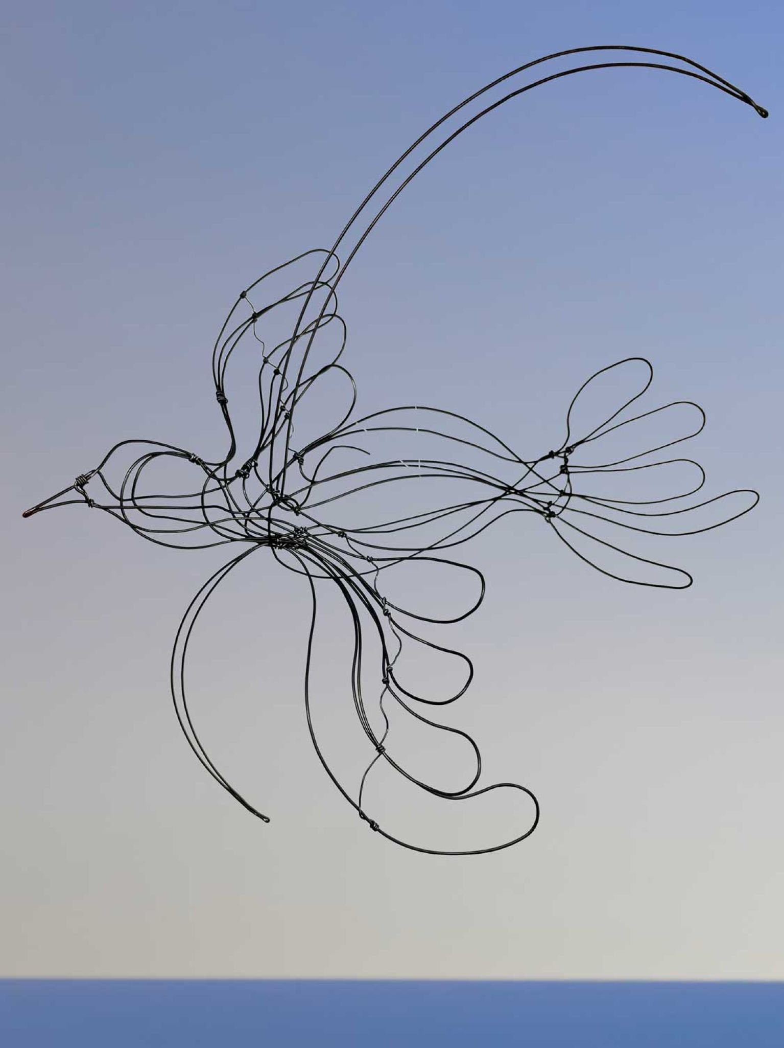 À travers l’entrelacement des fils d’acier, je façonne une forme libre, mouvante, presque impalpable. Je cherche ici à donner corps à un souffle, à une vibration, à un message porté par l’air.