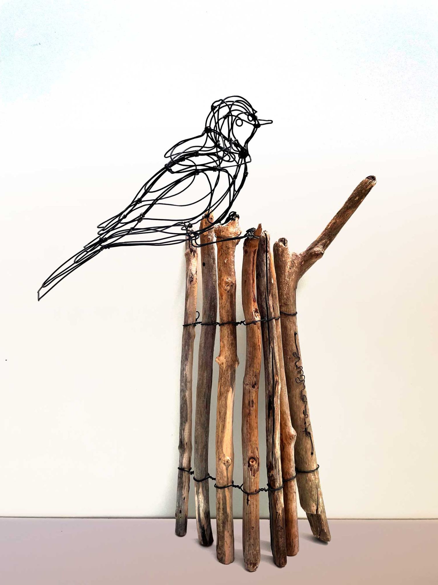 Le fil de métal dessine l’oiseau avec justesse et délicatesse, tandis que le bois brut lui offre un socle naturel, presque poétique.