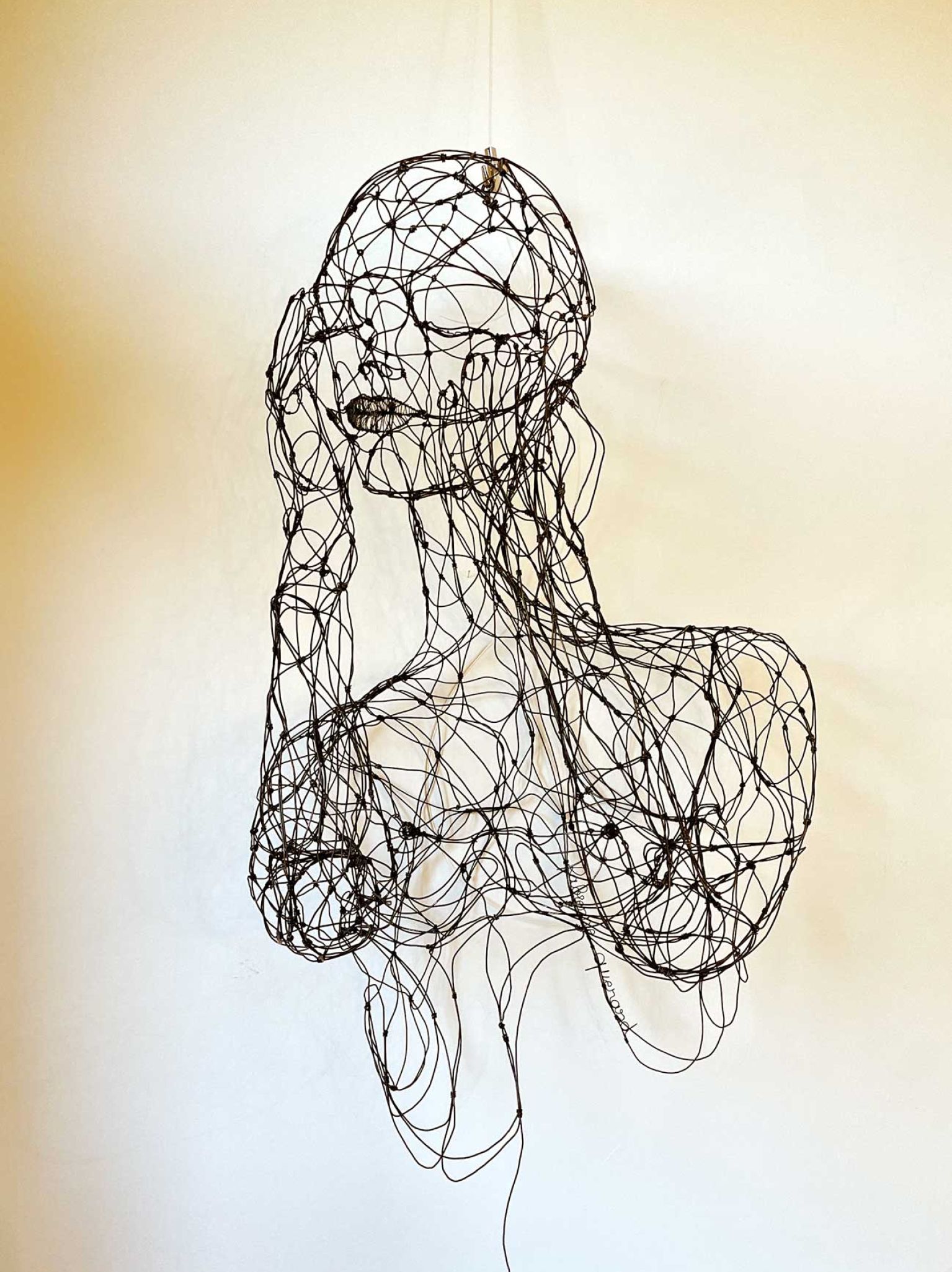 Cette sculpture représente un buste de femme noire, façonnée à la main en acier recuit. Elle porte dans ses gestes toute la douleur contenue, la retenue imposée, mais aussi une révolte silencieuse. Ses mains couvrent son visage, dans un cri muet. Sa nudité, assumée, renforce la tension émotionnelle : celle de femmes racisées, souvent invisibilisées, mais debout, dignes, et porteuses de lumière.